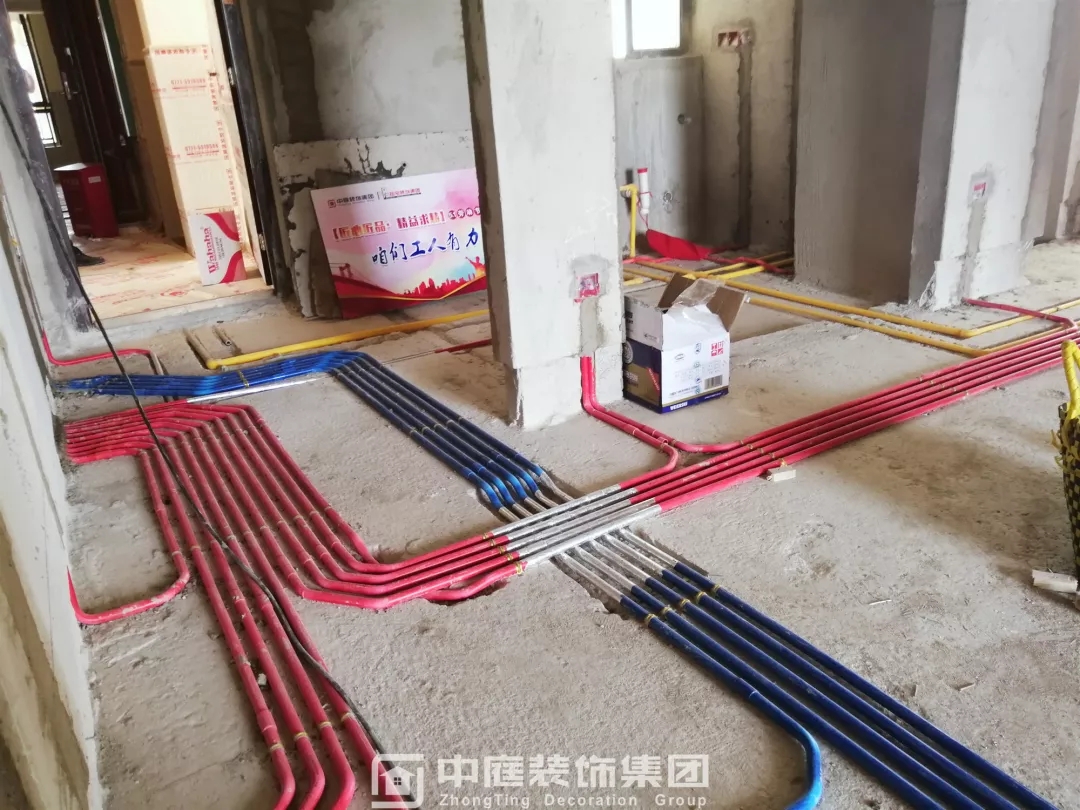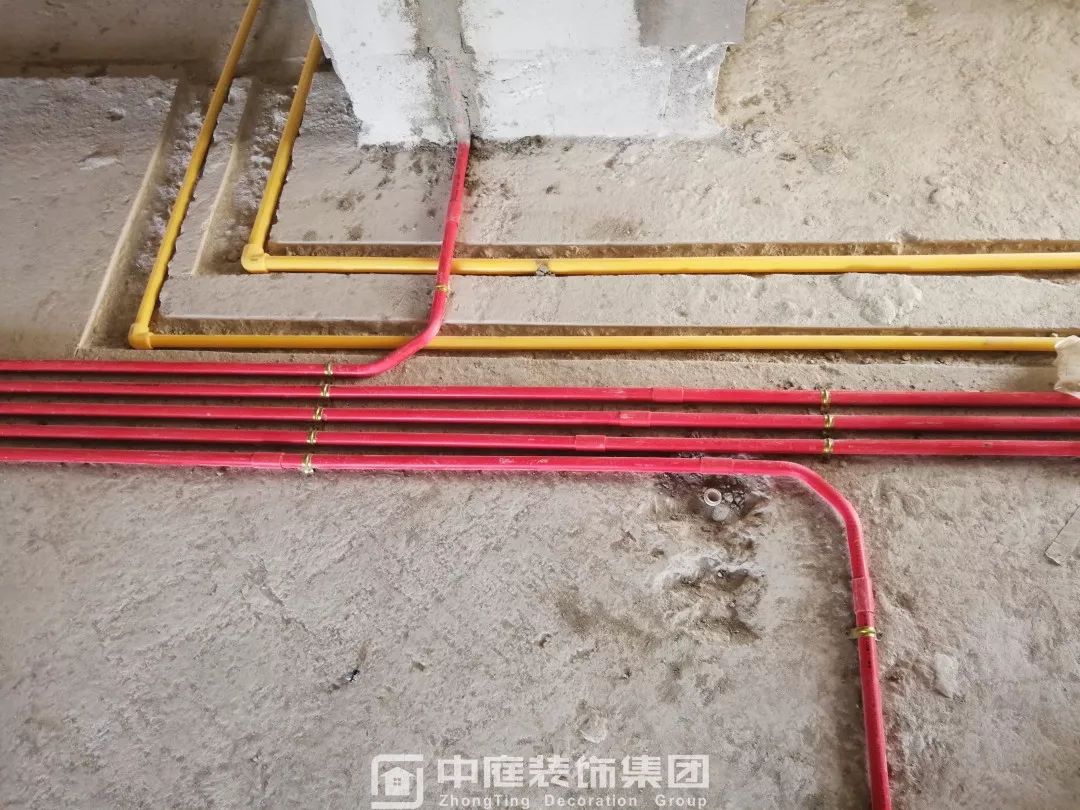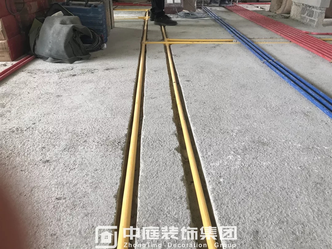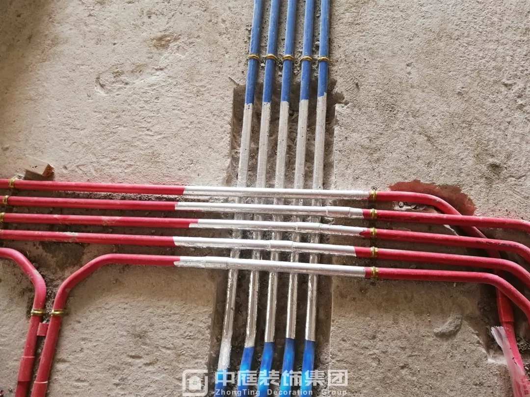 施工現場線管鋪設橫平豎直,按照集團施工規(guī)定使用鐵皮卡扣固定,管和管之間留有足夠縫隙,以便鋪設地磚時水泥砂漿進入管下,避免地磚后期出現空鼓;強弱電交匯處,用錫紙包裹保護,可以有效防止對弱電產生信號干擾。
