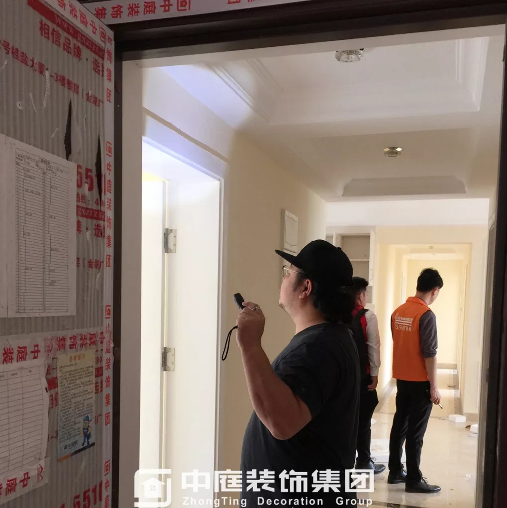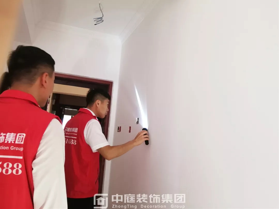利用強光手電筒檢查墻面平整度及陰角是否達到集團施工標準