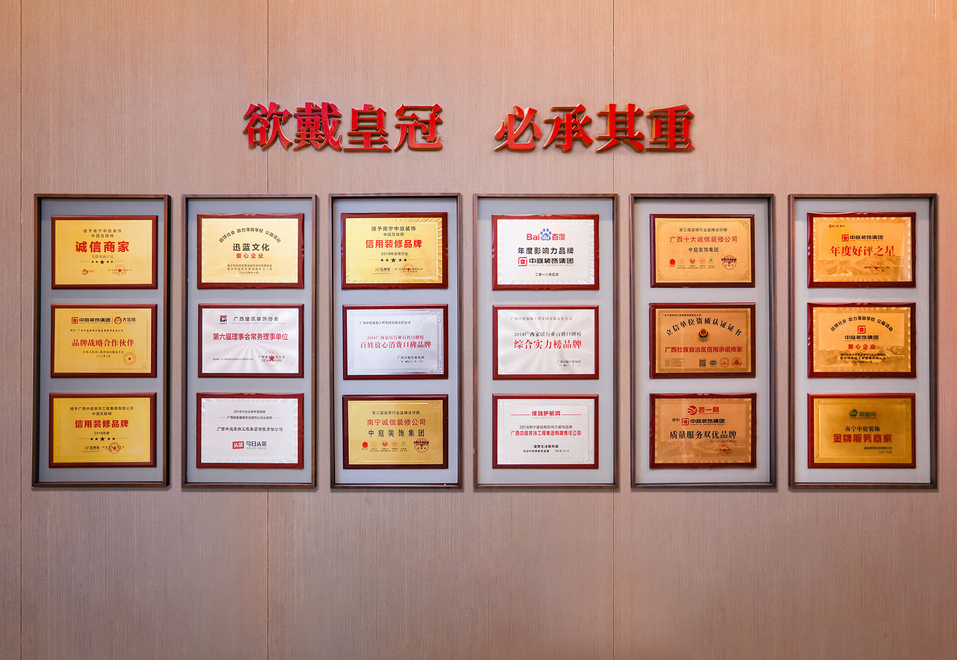 集團堅持以匠魂匠心筑家,憑借統一規范的施工工藝、卓越的品質、良好的信譽及優質的服務頻獲認可,多次榮獲“3·15誠信企業”、”廣西壯族自治區信用裝飾示范企業”、”廣西壯族自治區信用承諾商家”、“百姓放心消費口碑品牌”、“廣西影響力·工匠精神品牌”等榮譽稱號。