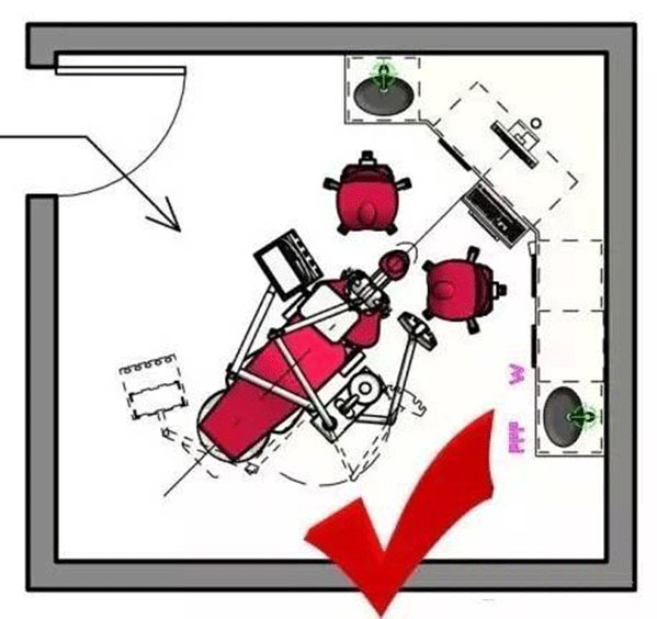 關于牙椅設備的擺放原則一是 病人進入診室,坐上牙椅的路程最短為佳,二是盡量避免患者腳端直接對著門的方向,病人隱私差,不安情緒強。如下圖: