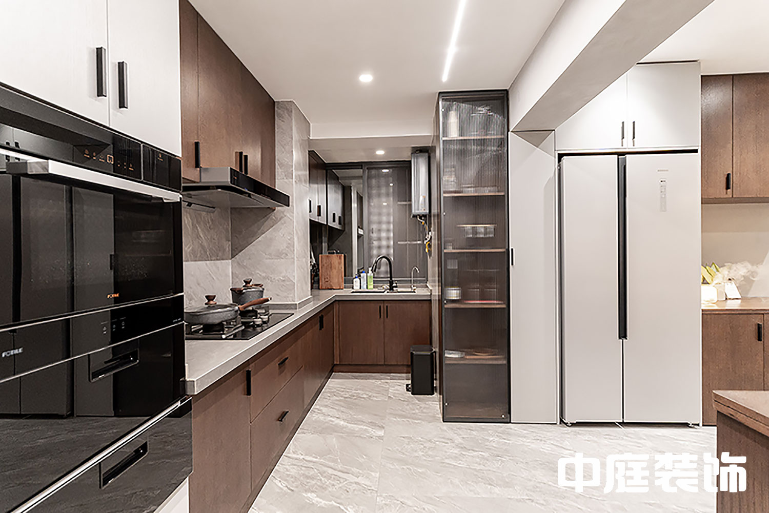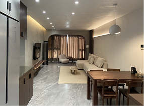 整體風格走向為侘寂風,還原生活的樸素與寧靜,這個戶型的痛點是廚房過小,入戶沒有玄關,且采光差。設計把原有廚房往外擴,與原有入戶形成有序的一體動線。開放式廚房,嵌入式冰箱巧妙設計與原有柱子融為一體。